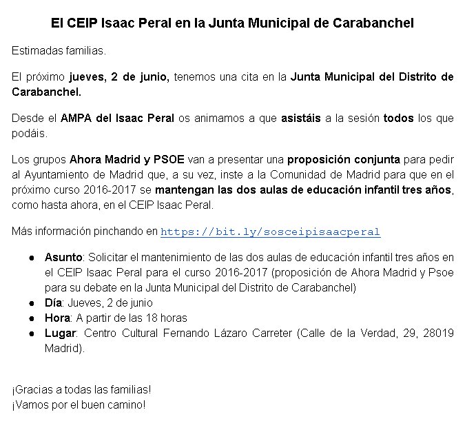 Mañana jueves a las 18h a la Junta Municipal Centro Cultural Fernando Lázaro Carreter C/Verdad 29 #SosCeipIsaacPeral