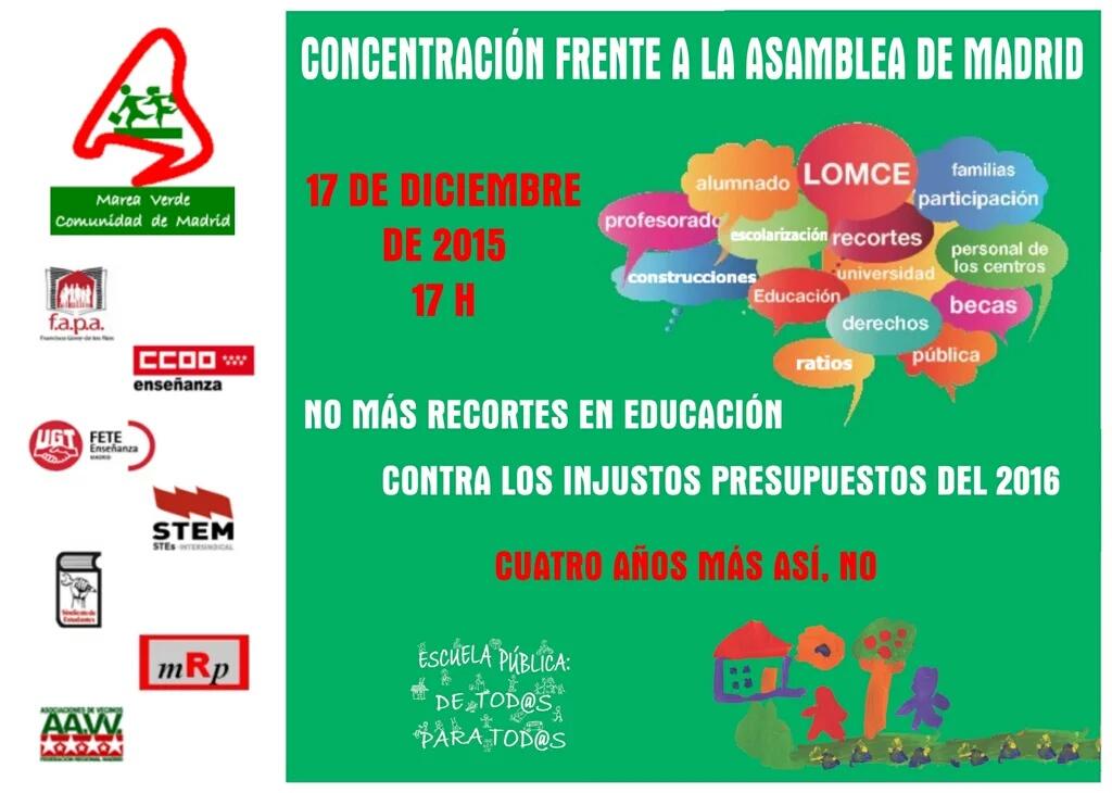 17-12-15: Concentración NO MÁS RECORTES EN EDUCACIÓN. CONTRA LOS INJUSTOS PRESUPUESTOS DEL 2016 (17:00 h, frente a la Asamblea de Madrid)