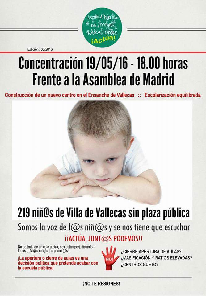 19-5-16: Concentración por la construcción de un nuevo centro público en el Ensanche de Vallecas (18:00 h, frente a Asamblea de Madrid)