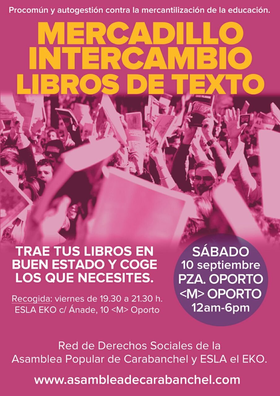 10-9-16: Mercadillo intercambio libros de texto organizado por la Asamblea Popular de Carabanchel (de 12:00 a 18:00. Plaza Oporto)